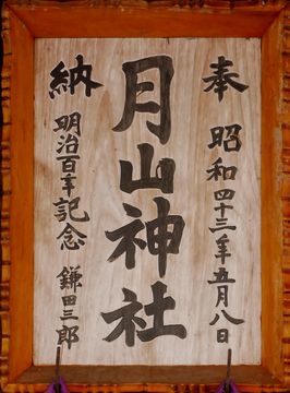 天文5丙申年月山大権現再築。慶安3庚寅年奉造営月山大権現・宝永7庚寅年再建月山大権現。文化2乙丑年建立月山大権現。万延元庚申年奉崇信神璽正一位月山月夜見尊。明治3年月山神社と公称。昭和39年現在地に再建今に至る。