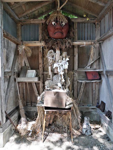鹿島様。秋田県で見られる民間信仰で道祖神の一種。稲ワラで「鹿島様」と呼ばれる巨大なワラ人形を作り奉ることで、病退散・家内安全・五穀豊穣が願われる。特に湯沢市岩崎地区では高さ4m程の人形が作られ、村の入口に置かれる。