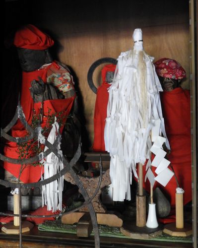 神殿の少しおくまった所に三体の地蔵さんがあり、そのうち木縁には次のように記されている。『摂津国南波庄住源朝臣佐々木亦右衛門寛文十一年七月二十四日』の銘がある。