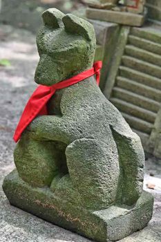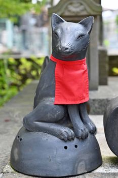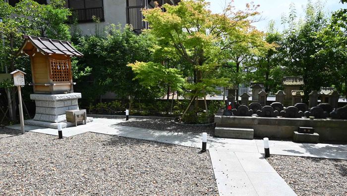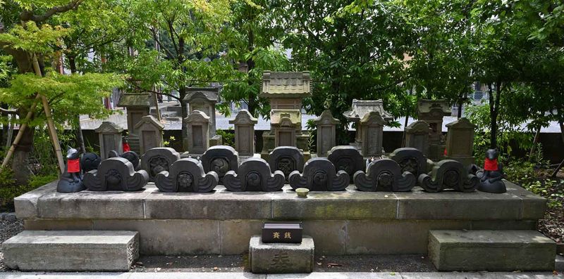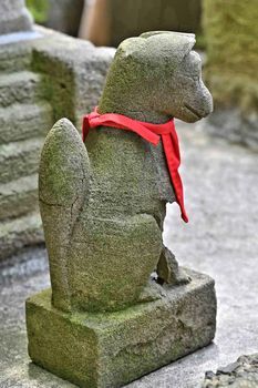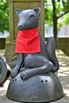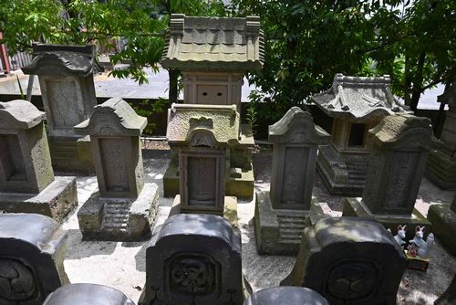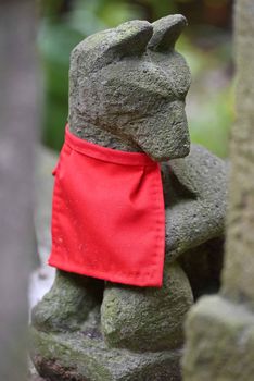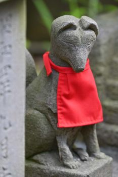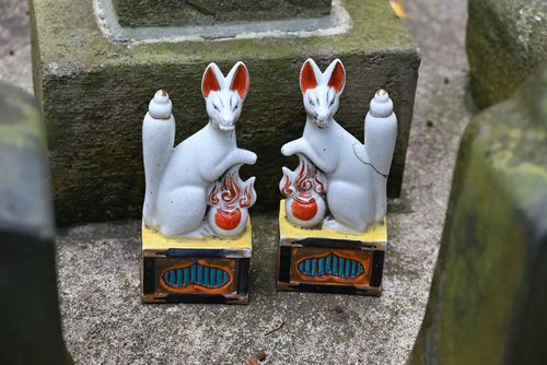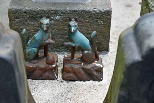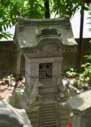 鬼瓦と石祠など。石祠の裏に狐が隠れています。