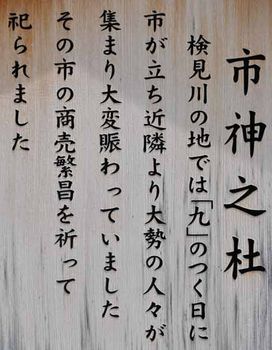 検見川では「九」の付く日に市が立ち、市の商売繁盛を祈って祀られた。(市神之社案内板より)