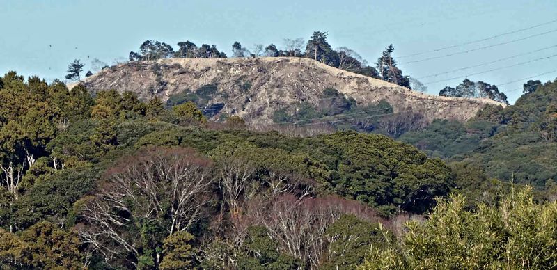 神社境内の左側から北方向の山の上を見ると、今話題の太陽光発電建設現場の見える神社です。ここの狛犬も蛇紋岩で可なり溶けて来てますね。