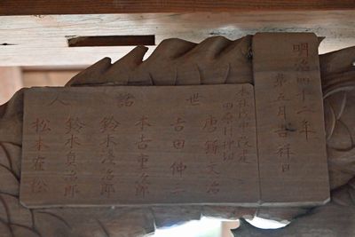 大工は池田、木挽は川代、石工は押切と地元の人ばかり。石工の唐鎌源次さんは世話人の唐鎌文治と親戚かな?彫刻は館野村国分(現在の館山市東部)の後藤喜三郎橘義信(初代義光の門人)。