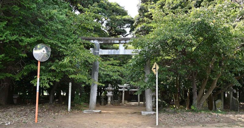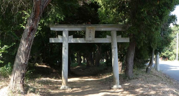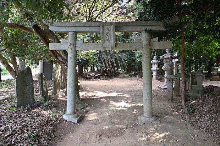 手賀と片山両地区の鎮守である。古来、手賀の”八幡様”として知られ、バス道路と平行して長い境内をもっ森域である。この南北の方向に、幅約五メートル、長さ二百メートルに及ぶ長い一直線の通りは、参道ならぬ”馬場”と称され、南北両端には廿型の結界門があり、以前はその間を牛馬などが通行することは一切禁止されていた。