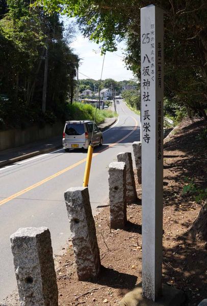 神額・八坂神社 長栄寺標柱。後の道は県道282号線。