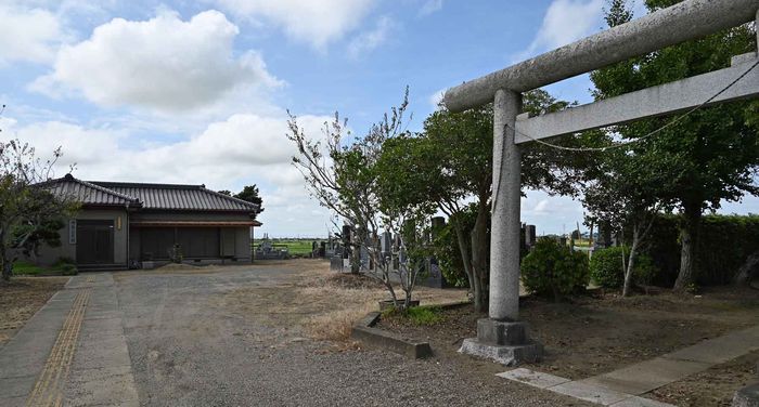 神社墓地公民館入口。右が神社で中央が墓地。奥に公民館の配置です。
