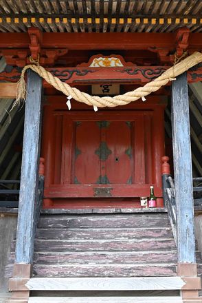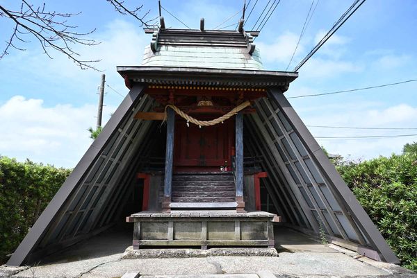 神社裏側。後ろの屋根の急こう配が確認出来る。
