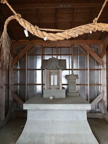 注連縄・本殿。木と石で出来た石宮。