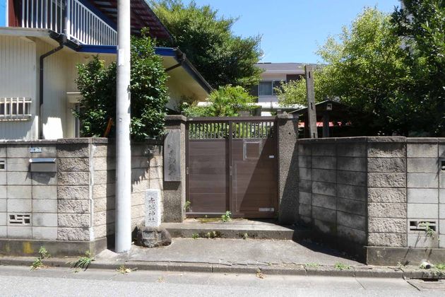 社号標・神社入口。インターフォンの無い入口。鍵が掛かってないので入ってみた。関係者以外立ち入り禁止の看板も無し。ここに神社が鎮座してるとは思えない。