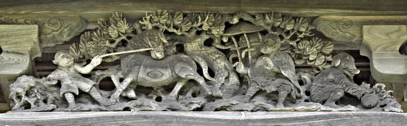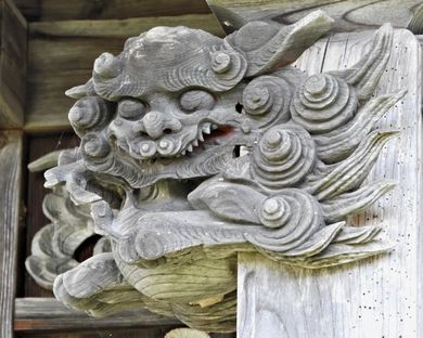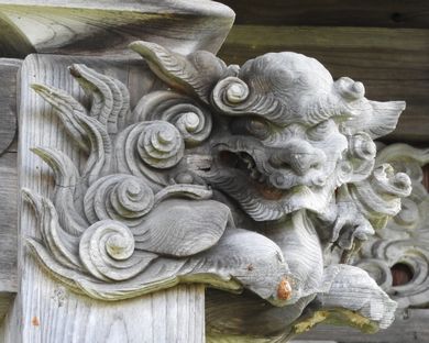 向拝の彫刻と木鼻の狛犬