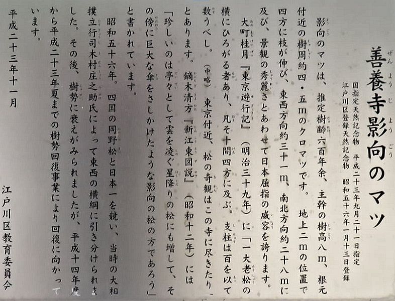 善養寺は、東京都江戸川区東小岩に位置する真言宗豊山派の寺院です。大永7年(1527年)に創建され、130余りの末寺を有する中本寺格の寺院として知られ、「小岩不動尊」の別名でも親しまれています。境内に生育する「影向のマツ」は、国の天然記念物に指定されており、600年以上の樹齢を誇り、四方に枝を広げた姿はまるで巨大な盆栽のようです。「影向」とは神仏が仮の姿をとってこの世に現れることを指し、このマツの名はその由来にちなんでいます。