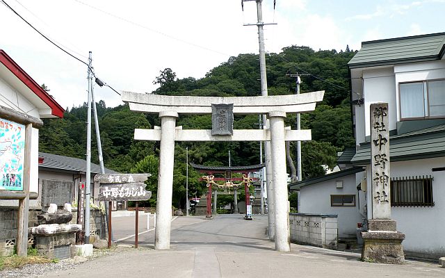 この神社は、東北自動車道・黒石ICより十和田湖方面へ向かう102号線を5km程ゆくと黒石温泉。その黒石温泉の北側、不動舘の渓谷に鎮座しております。享和2年(1802)弘前藩主津軽寧親公が京都より百余種の楓苗を取り寄せ移植したのが始め、と言われる中野もみじ山の中に社殿があり、大変景色の良い神社です。