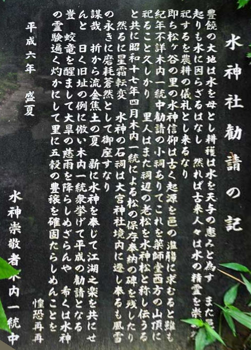 由緒松ヶ谷の里の水神信仰は古く起源を邑の濫觴に求むると雖も紀元不詳木内一統中勧請の小祠ありてこれを薬師堂西方の山頂に祀ること久しかり里人はまた祠辺の老松を水神松と称し伝うると共に昭和十七年四月木内一統による松の保存奉納の碑を残したり然るに星霜転変 水神の石祠は大宮神社境内に遷し奉るも風雪の永きに磨耗蒼然として御座すなり