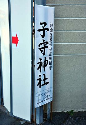 神社案内板。初詣は幕張地区総鎮守「子守神社」とあります。