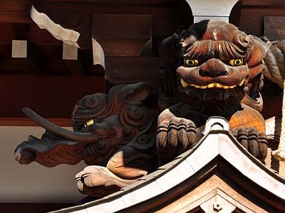 | やや損傷が目立ちますが複雑な文様のユニークな狛犬です。 | |