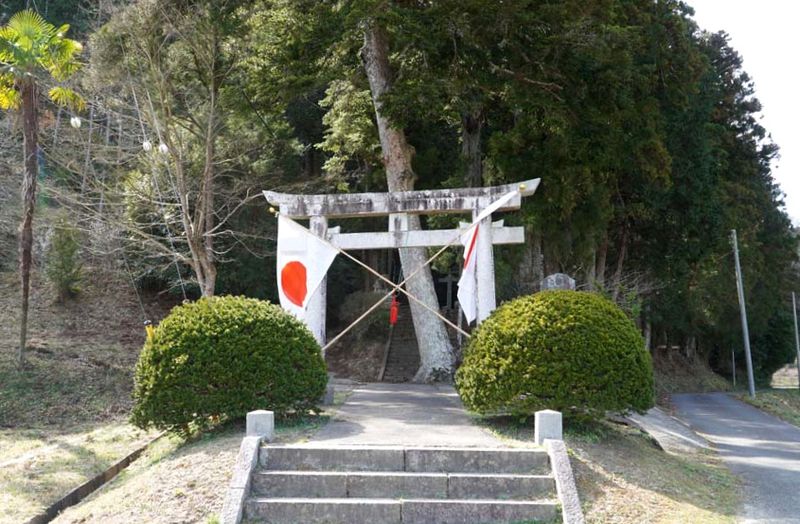 神社入口。この日は天皇誕生日でしたので、国旗が掲揚されていました。