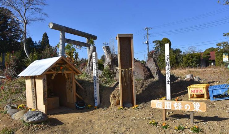小湊鉄道総元駅から国道465号線を北西に470m進んだら左折し橋を渡り、130m直進したら右折し160m進むと目の前に蜜蜂乃碑と鳥居が見えます。