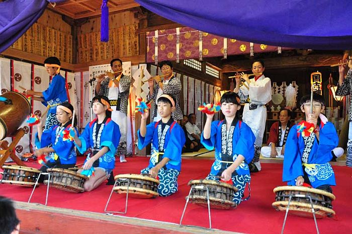 五柱神社の氏子さんによるお囃子。世代交代は上手く行ってるようでした。