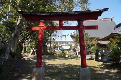 いすみ鉄道の大多喜駅から東に二つ目の上総中川駅から北に約150mの位置に鎮座。右隣は本迹寺です。遠くからでも目立つ狛犬さんが鎮座する神社です。
