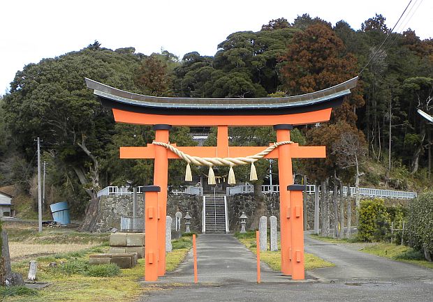 この神社は、JR安房鴨川駅の北西7km程の辺り、鴨川市より北西に広がる田園の中に小さな山を背に鎮座しております。石垣で囲まれた、一段高い境内は豊かな緑に包まれ大変景色の良い神社となっております。