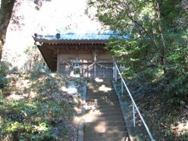 この神社は163号線・根本信号から北に入り、根本と小糸大谷の境界あたりで二股を左に入り、犬の散歩の方くらいしか利用しないと思われる山あいの気持ちの良い道路を進むと、左手に鎮座しています。十数段の階段を上がると、すぐに目の前が拝殿です。そしてその拝殿手前の灯籠前には、極小さな、けれどしっかりとした造りの、味のある狛犬さんがいました。
