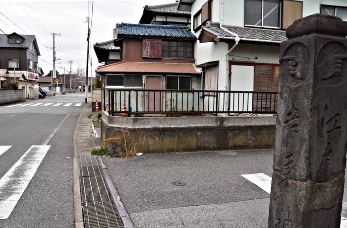 道標と建立者。吾妻神社の指の方向に鳥居が見える。右は江戸道。