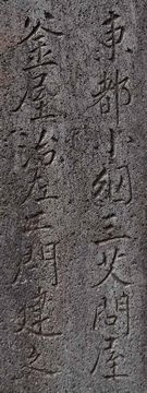 安政五戊午年(1859)建立の道標。日本橋小網町にある釡屋もぐさ本舗は、創業1659年(万治2年)のもぐさ(お灸)専門店。もともと鋳物師の家系だった初代が廻船問屋として日本橋で独立し、故郷の近江辻村(現在の滋賀県粟東市辻)のもぐさを仕入れ、旅の携帯用として売り出したのが始まりだという。釜屋治左衛門の艾店では、市中で切艾の振り売り(店以外で商品を売り歩く行商)を行っていて、この道標が木更津でも商売していた証明となる。