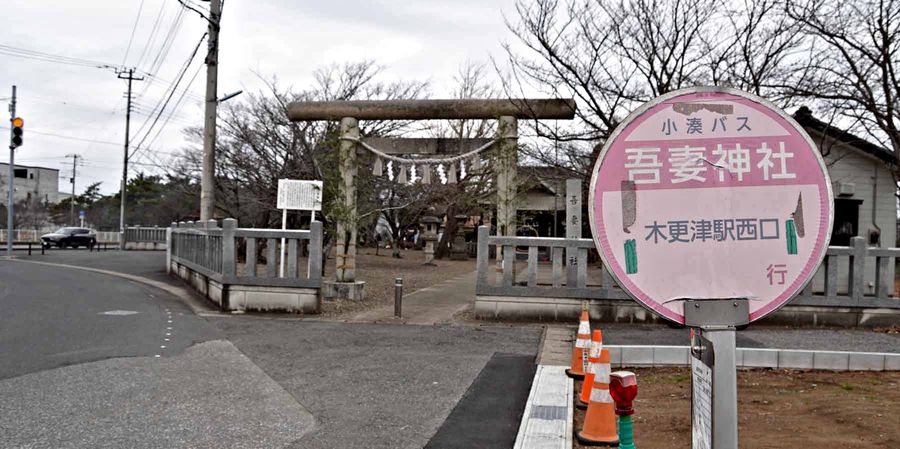 祭神は弟橘姫で、江戸砂子に「君去津吾妻大明神は即ち立花姫の霊社也」とあり、社伝にも日本武尊御東征のみぎり相模から上総へ渡ろうとした時、海上にわかに荒れ海に身を投じた姫のお袖が数日後この近くの海岸に漂着したのでこれを納めて吾妻神社を建てたとあります。
