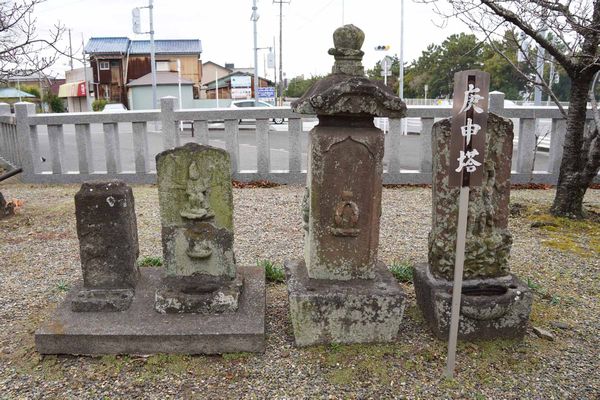 右側青面金剛・三猿庚申塔。標を兼ねた三猿庚申塔。珍しく三面分離型の庚申塔で、これよりひがし えどかいとと彫られている。猿は言わ猿だ。
