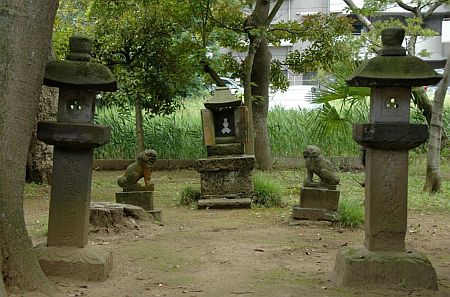 京成津田沼駅より約350mの所にあります。参道右側には3社あり、それぞれに狛犬が居ます。参道の狛犬3組と合わせ6組の狛犬が見ることができます。