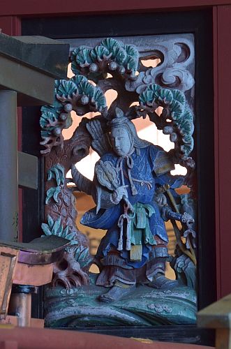 | 釈迦堂正面、一対の柱に素晴らしい狛犬の浮き彫りがあります。拡大写真はこちら。 | |
