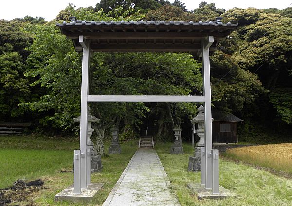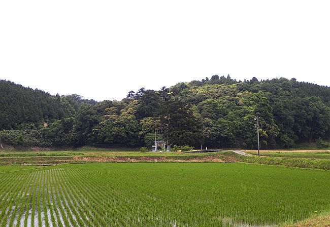 目印は、「衣かけの大杉」と呼ばれる大きな杉の木で、田んぼの中を真っ直ぐ伸びる参道に、鳥居のように枝を伸ばしています。神社の入口には神橋が架けられ、社号標と鳥居が立ち、15m程の平らな参道の後の鬱蒼とした木々の中に、石段の参道が境内入口まで作られています。