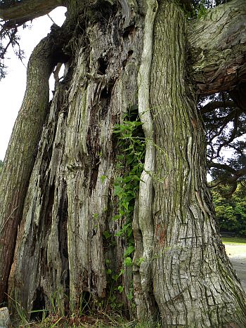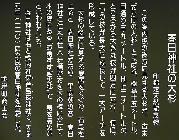 一つの枝が長大に成長して、一大アーチを 形成している。平安朝の昔、春日神社に仕えた社人・社僧が衣を木の枝にかけて、