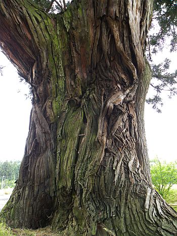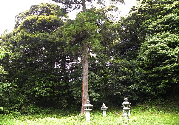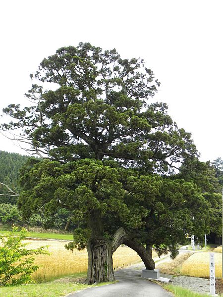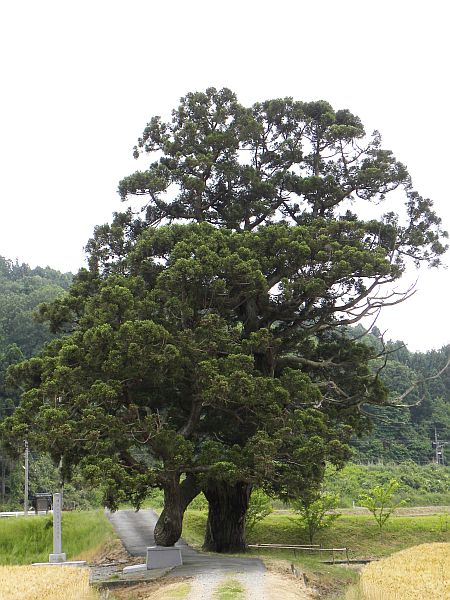 古来 「衣かけの大杉」とよばれ、地上2mのところから大きな枝が四方にたれ、特に、