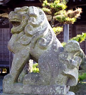 | 拝殿前、手前の狛犬。拡大写真はこちら。 | |