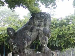 雨に濡れながらも、カッと空を見上げて 威嚇している耳垂れ狛犬