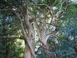 | 絡み合う大榧、大藤 | 大榧、大藤の根本に祀られる 庚申塔、末社 |