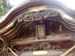 牡丹の花で着飾ったおっとり狛犬。 阿は口中に玉を、吽はよく似た子を連れている。