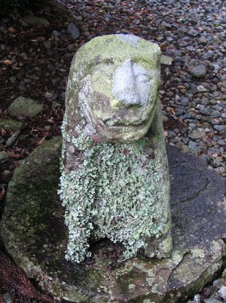右の階段上の苔むしたはじめちゃん。耳が殆ど無く、眉毛があり、目尻がきちんと尖った眼がつき、鼻筋が通っているので、上から見ると人面か、スフィンクスが笑っているように見えます。300年近く境内に座っているので苔むして、所々身体が見えなくなってしまいました。尻尾は猫のように少し長いものが背中にピタッと付いています。
