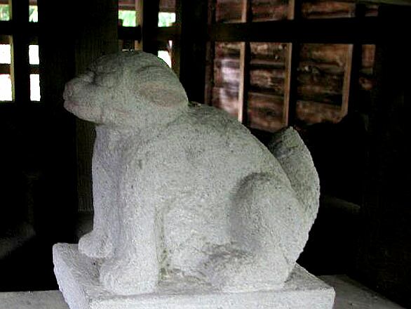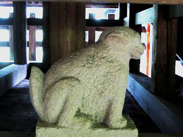 本殿脇の進化したはじめちゃん。阿吽が反対で、吽には円錐形の角があります。 鬣や尻尾も創意工夫の跡が見られ、お腹の下が刳り抜いてあればもう十分狛犬の領域に入ります。