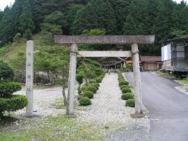 この神社は下呂方面から国道257号線で来たら万賀交差点で右折、国道256号線に入り約1.5km左側に鎮座しています。拝殿の後ろから長〜い階段を登った山の中に本殿がある神社で陶器製の狛犬が居ましたが、阿は首から上が壊れていました。