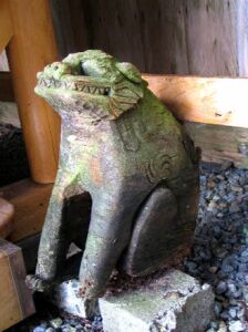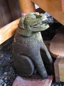 本殿前の木彫狛犬。下半身の造りは素朴で手抜きのようにも見えますが、上半身、特に顔の造りには力が入っています。阿吽が反対位置にいて吽の身体には模様が残っています。耳垂れで上から見ると獅子頭のように見えます。