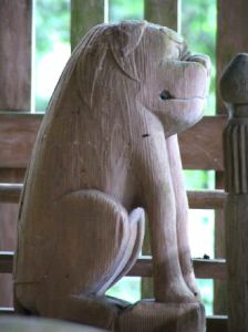 本殿脇、前足が長く姿勢正しく蹲踞している木製狛犬。耳は鬣と区別が付かないくらい垂れ下がり前から見ると優しい獅子頭のような顔です。阿吽が反対位置に置かれています。加子母では二渡神社にも木製狛犬が居ますが形態が全然異なります。