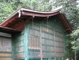 高山線・飛騨国府駅の北東約3km、国宝の経蔵がある安国寺の裏山の洗心の森内に鎮座している、安国寺の守護神を祀る神社です。ここの本殿は室町初期の代表的建造物で三間社見世棚(さんげんしゃみせだな)造、国の重要文化財に指定されている程なので、分かりにくい登り坂の細い道にもかかわらず、やっとの思いでたどり着いたのに、本殿は完璧にさや堂に納められ、見ることは出来ませんでした。重文・国宝などの建物にはよくあることなのですが、何とか保護しつつも公開出来る方法はないものでしょうか?