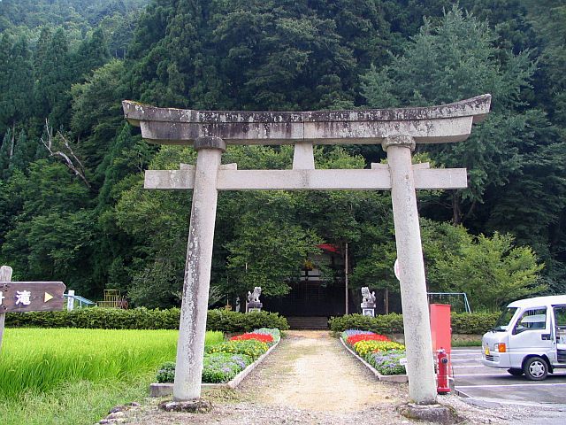 飛騨古川から東に延びる473号線、柏原地区の岩舟滝の近くにこの神社は鎮座しています。 社殿の前には2本の桜の木があり、時期には満開の花が見られ、背後の緑と相まって実に見事な光景を醸し出すであろうと想像できます。その桜の陰に隠れるようにして桟瓦ぶき切妻の妻入りの社殿が建ち、参道にはどなたの手入れによるものか、クジャク草やサルビアの花が綺麗に咲き誇っていました。管理の行き届いた綺麗な神社です。又、ここには、どこから来たのか、青い目をしたしょうわ狛犬がいました。