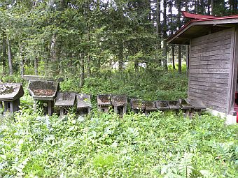 | 社地左側に置かれている双体道祖神 寛保元年(1741)作で、かなり摩耗が進み顔の表情などは良く分かりません。 吾妻村から旧小野上村に入って初めて出会う道祖神で、街道を旅する人々が 道祖神に手を合わせ、森の木陰で暫し憩いの一刻を送ったのではないでしょうか? |