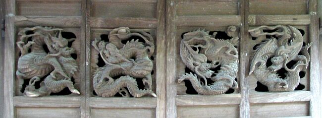 | 拝殿扉に彫られた龍四態。扉に彫られた物はとても珍しいと思います。 | |