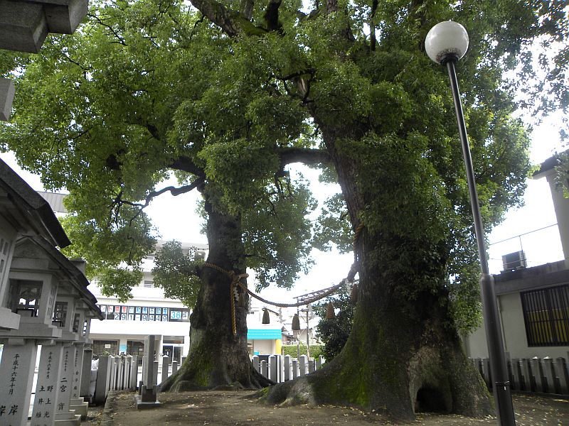 この神社は、山陽本線・横川駅の北北東1.5km程の辺り、太田川と太田川方水路に挟まれた中州に鎮座しております。遠目にもそれと分かる楠の巨木が目に入り、神社よりも、天然記念物の夫婦楠木が有名なようです。境内は市街地のわりには広く緑も豊かで大変落ち着いた神社となっております。