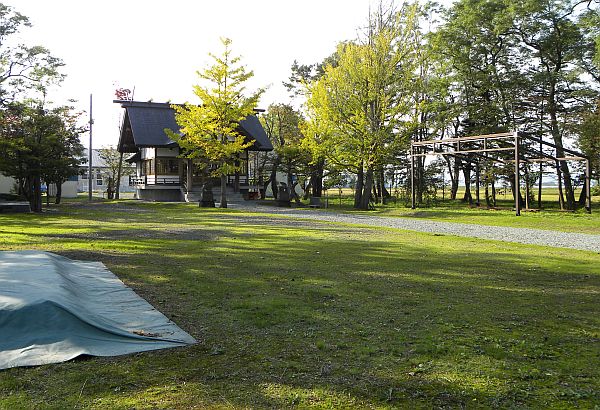近代的な住宅の間に社号標が立ち、鳥居が建立されています。参道は西に向かって延びており、境内入口には灯籠が建立されています。明るい境内の左手には土俵が設えられ、正面には大正10年生まれの構え獅が護る北海道独特の拝殿、神明造りの本殿が建立されています。又、境内には石碑が点在しています。