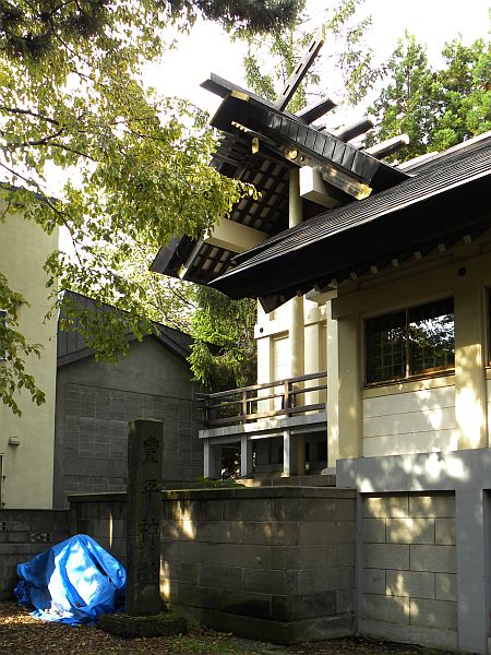 北海道独特の造りの拝殿と弊殿・神明造りの本殿は総て繋がって造られ、本殿脇には旧社号標が立っています。